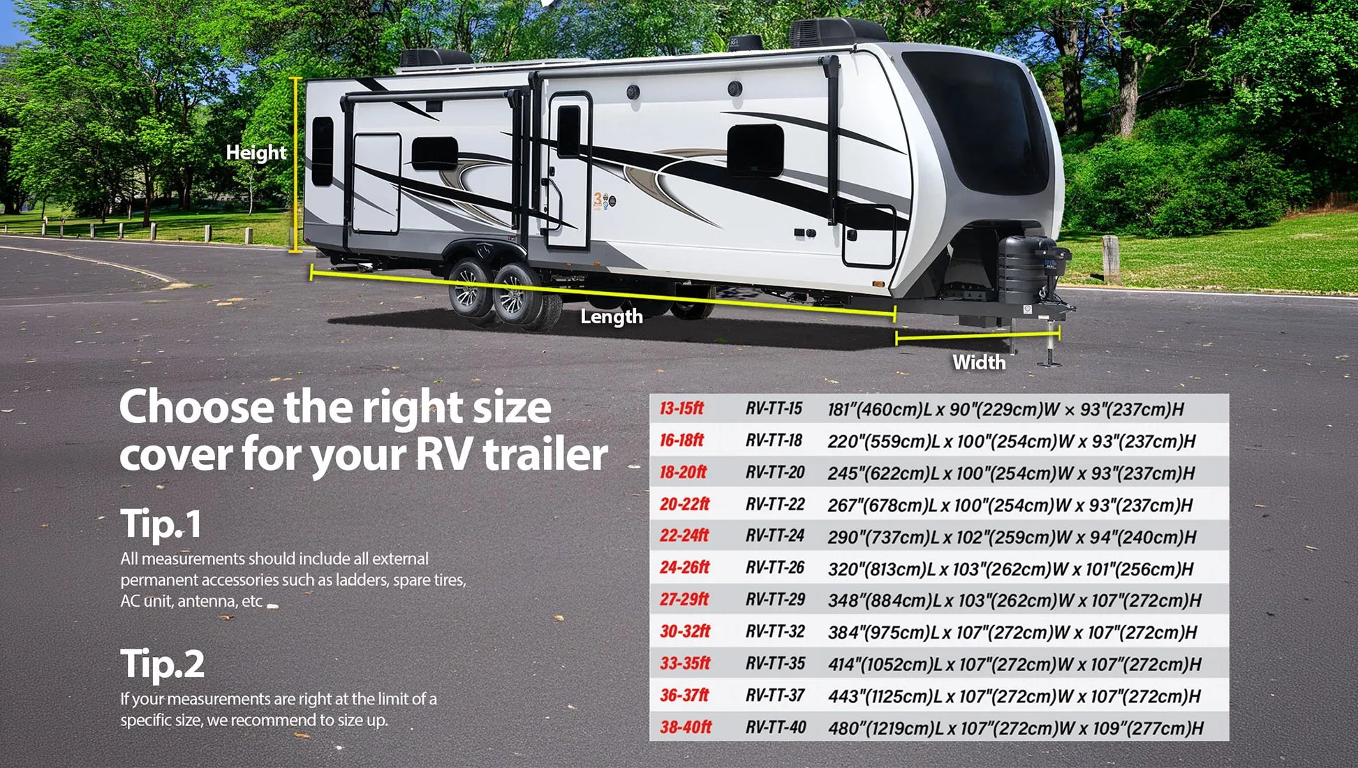 - 11 sizes fitting 15 ft through 40 ft RVs and trailers