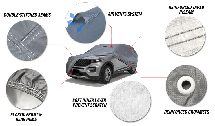 Designed with 6 layers of protection including: 1 Ultra durable outer layer, 3 Robustly bound outer layer, 1 Breathble membrane and 1 Scratch-proof inner fleece lining. Helps protect the car absolutely from small impacts as well as scratches-proof on the car's paint.
